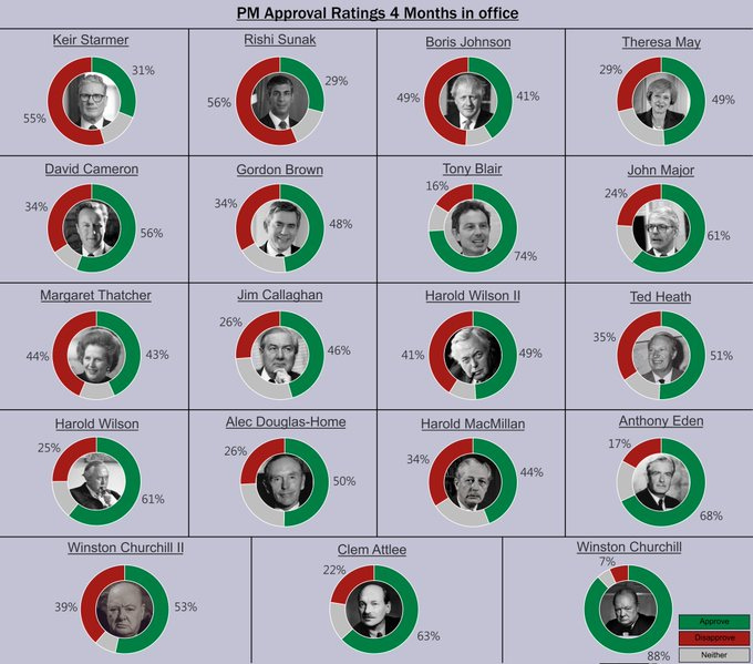 Chart showing the average approval rating for post-WW2 British PMs four months into office, courtesy of @RealLiv04.