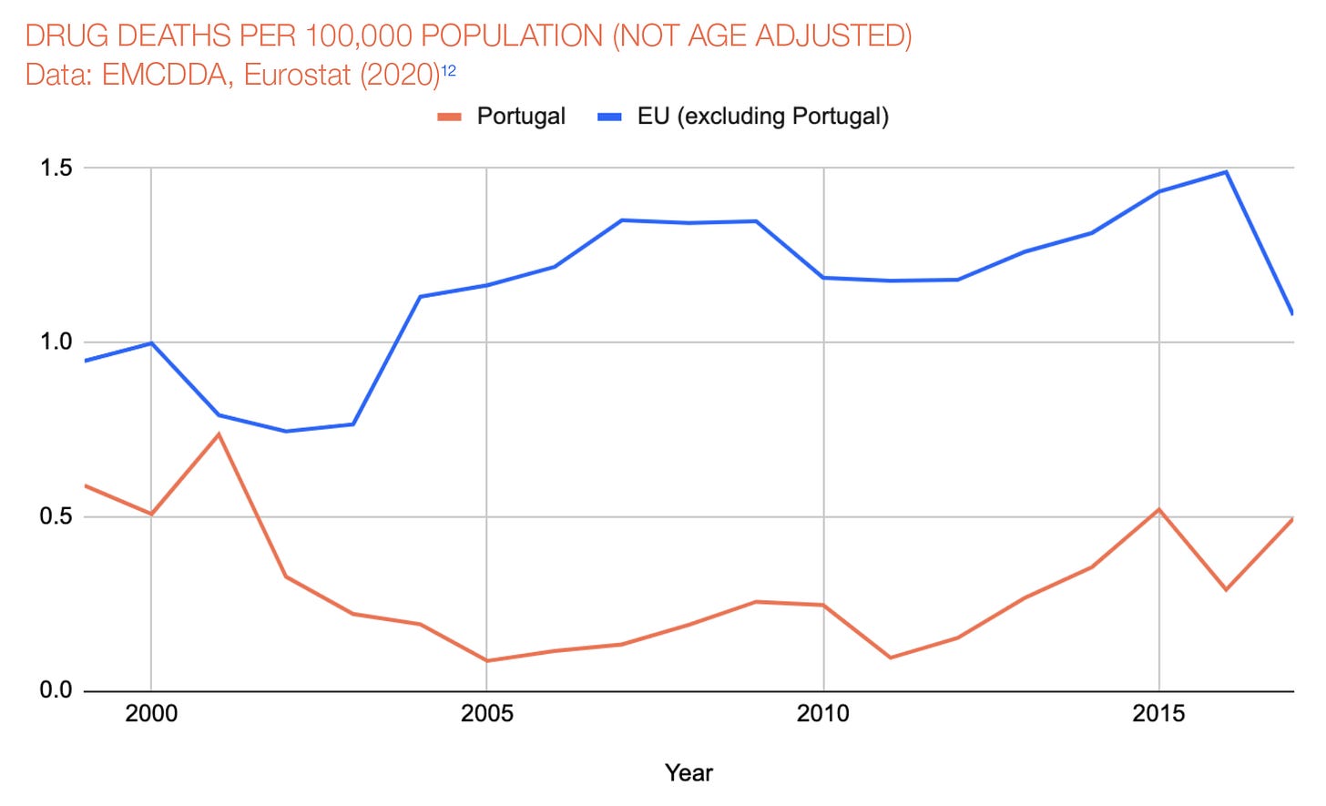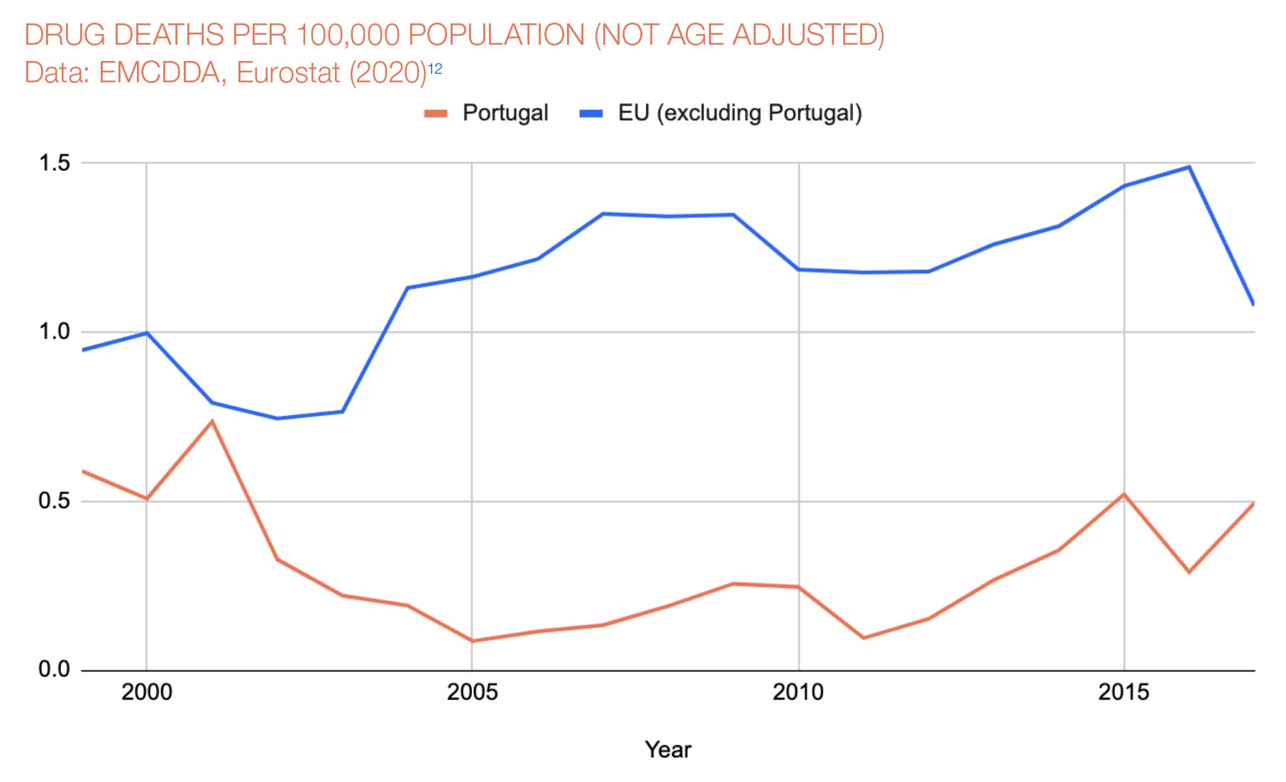 Graph 3: Comparing drug-related deaths per capita between Portugal and EU average; there is a noticeable decline for Portugal’s graph in 2001 when the decriminalization regime was introduced.