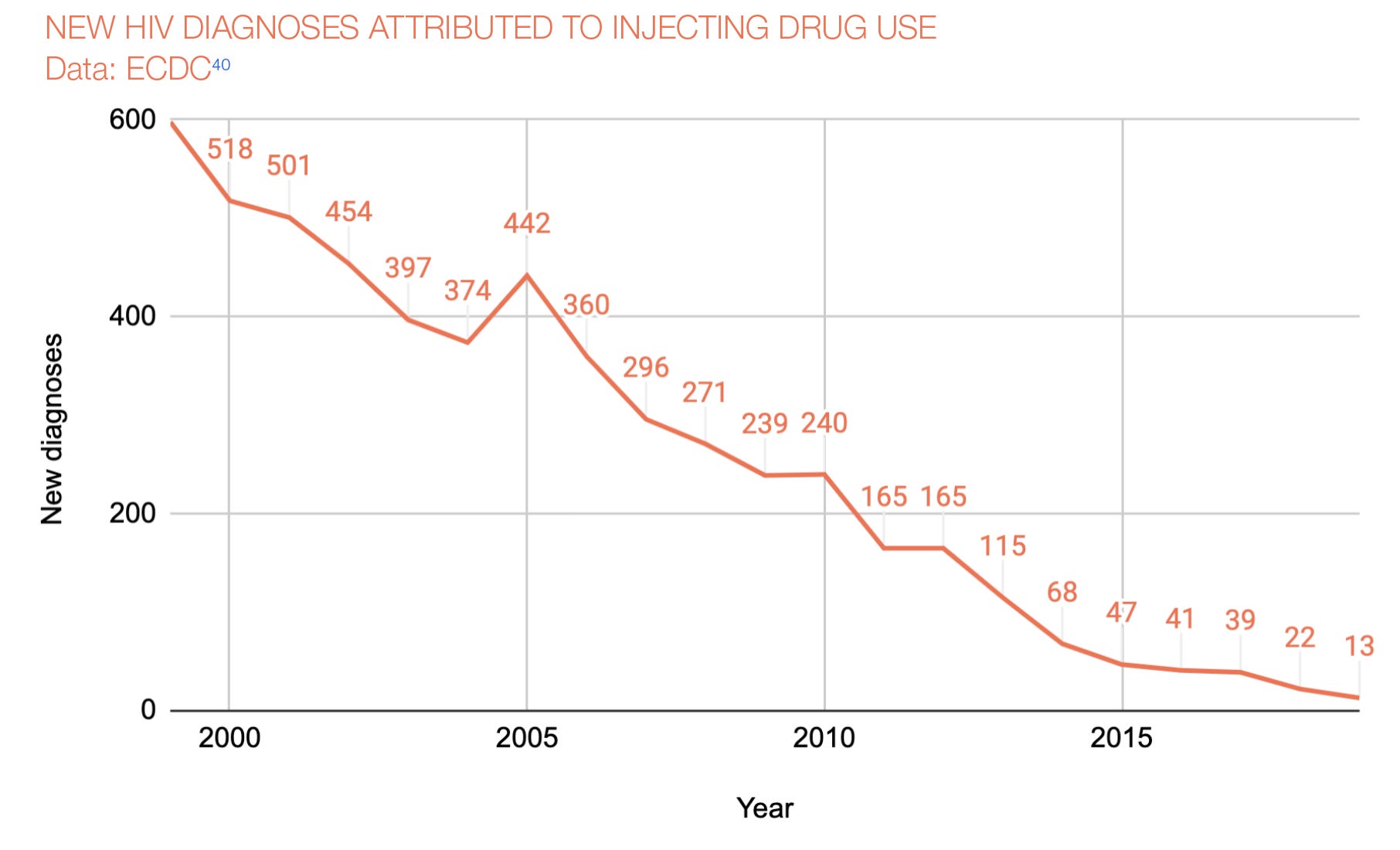 Since then, all signs point to a broad reduction in overdose deaths and consumption rates. New HIV diagnoses amongst drug users fell by 17%, and a general drop of 90% in drug-related HIV infections was recorded in the period from 2001 to 2020. There was an increased uptake of treatment - roughly 60% - as of 2012. The number of drug-related deaths in Portugal reduced from 131 in 2001 to 20 in 2008. As of 2014, Portugal's drug death toll sat at 3 per million, in comparison to the EU average of 17.3 per million, one of the lowest drug-related death rates in the EU and the developed world. And, while there was a noticeable increase in drug consumption during the recorded period, the increase in drug use observed among adults in Portugal was not greater than that seen in nearby countries that did not alter their drug laws. Finally, it is estimated that the social cost of drug use (the sum of public expenditure on drugs, the private cost incurred by the addict and costs taken inflicted on society) decreased by 12% on average in the 5-year period following the establishment of NSAFD in 1999, and an 18% on average reduction since 2010.’